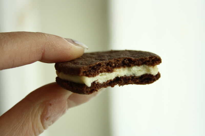Take the cream out of refrigerator. Take a teaspoon of cream, put on one side of the cookie and flatten with another.